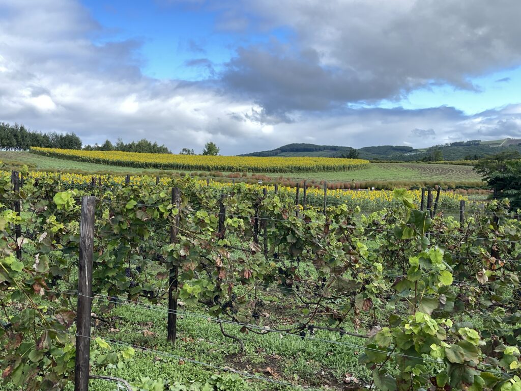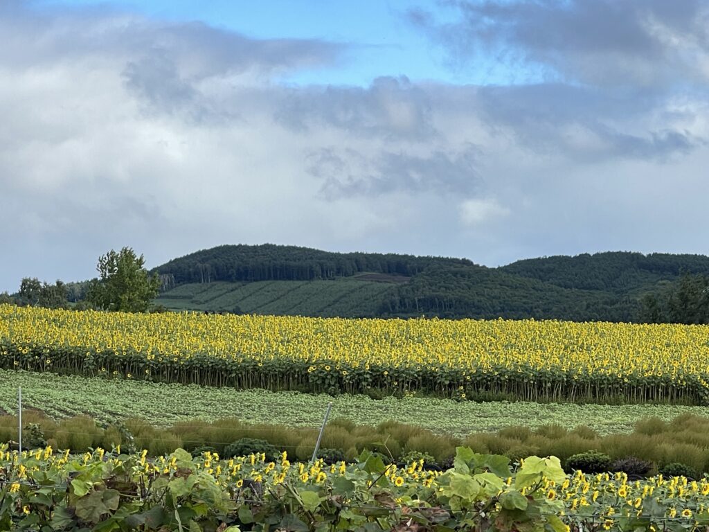 ぜるぶの丘から 北海道・美瑛 2025.09.27 「ぜるぶの丘」から見たウチの方向です。分かるかな?これじゃどこだか分からないよね。もうちょっと寄ってみます… このヒマワリ畑の左の方にある大きな木。この木、ウチの敷地に立っている一番大きな木です。シラカバのような樹形の、ウダイカンバ。この木の向こう側にウチがあります。(見えてないけどね。逆にウチからもぜるぶの丘は見えません)ウチから「ぜるぶの丘」には直線上には行けないけど、歩いても5~7分くらいで行けるかなあ。