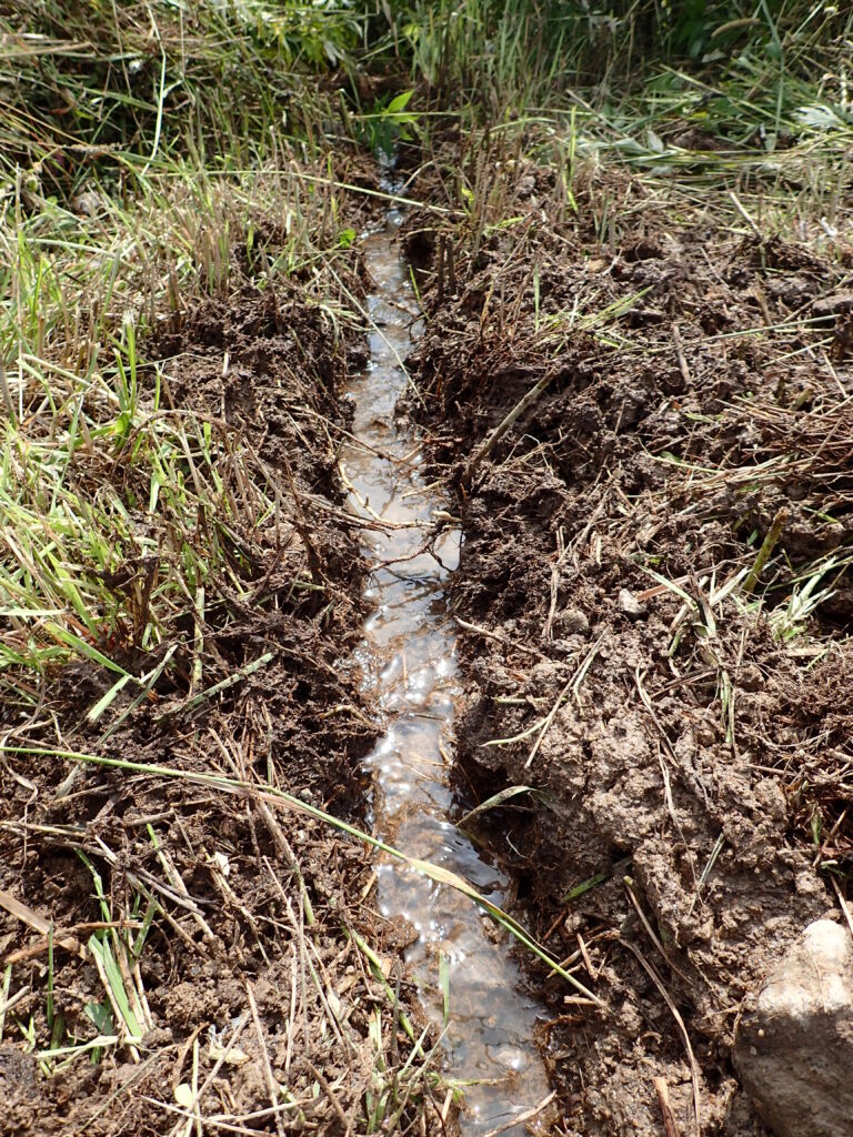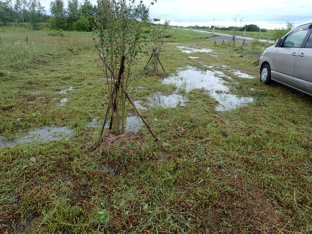 この土地、平らなのはいいけど、昔、何に使われていたのかな。田んぼ?畑? これだけ水はけが悪いと考えものです。沼じゃないんだから。何か対策を考えないとな。とりあえずは溝を掘って、水みちを作ると、川のように流れていきました。