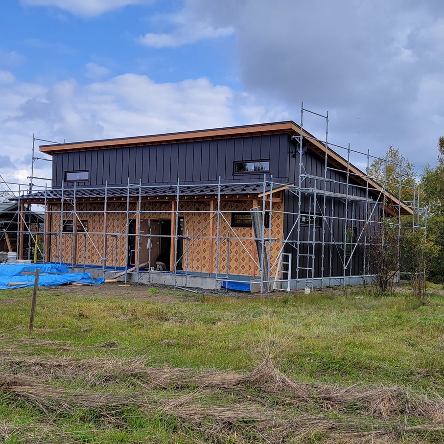 玄関前の軒下のある部分は板張りになりますが、たぶん色あせを少しでも遅らせるためにまだ張るのをやめているのでしょう。そのほかの部分はガルバリウムです。全部を板張りにするのも、おしゃれでかっこいいのですが、メンテナンスのことを考えると再塗装を頻繁にする必要のないガルバリウムの勝ちでした。聞くところによると、板張りだと、キツツキが穴を開けやすいということです笑。板張りの所は数年に一度、塗装をする必要がありますが、足場を組むことなく、脚立程度で手が届く範囲なので自分でできそうです。