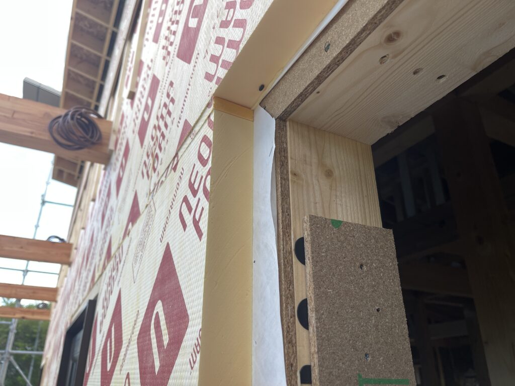 ドアの開口部から見た家の壁を作っている最中の断面です。柱にコンパネという板を付け、その上から防水シート(白い紙)を貼り、さらにこの分厚い断熱材を付けてあります。断熱材の厚さは47㎜。これは柱よりも外側で、室内は柱と柱の間に断熱材のグラスウールを詰めています。