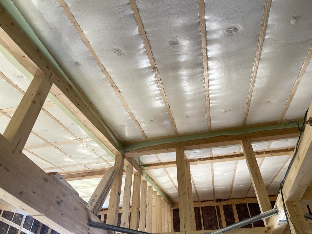 天井にも断熱材が。所々穴が空いていて、ここから断熱材が送られるホースを突っ込み、白いシートの中に充填していき、このように詰められました。壁も天井も、断熱材というお布団に包まれて、冬の寒さに備えるのです。