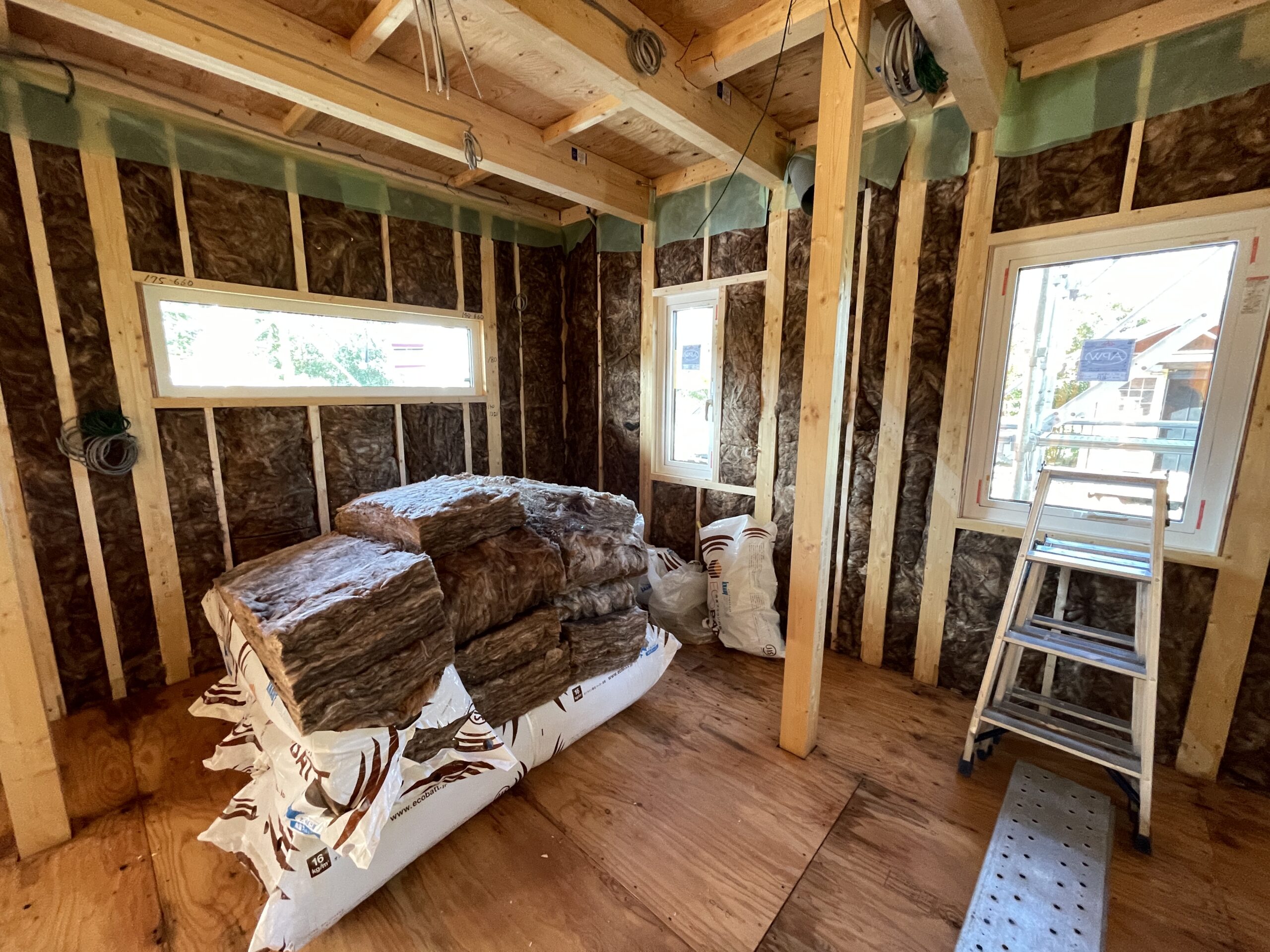 室内側、柱と柱の間には、ここに山積みされているグラスウール?が、びっしりと詰められています。厚みは10㎝ほどあるでしょうか。