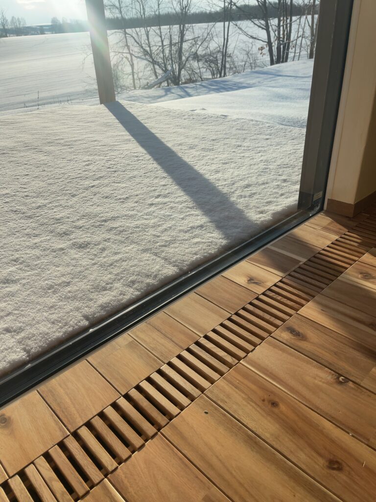 寒冷地の暖房 北海道・美瑛 2026.01.23 窓の下に、スリットが付いていて、床下から温かい空気が出てきます。家の中で、窓際から冷気が来るため、そこを温めて室内が冷えないようにしているんですね。おかげで外が氷点下であっても、室内はまったく寒さを感じません。