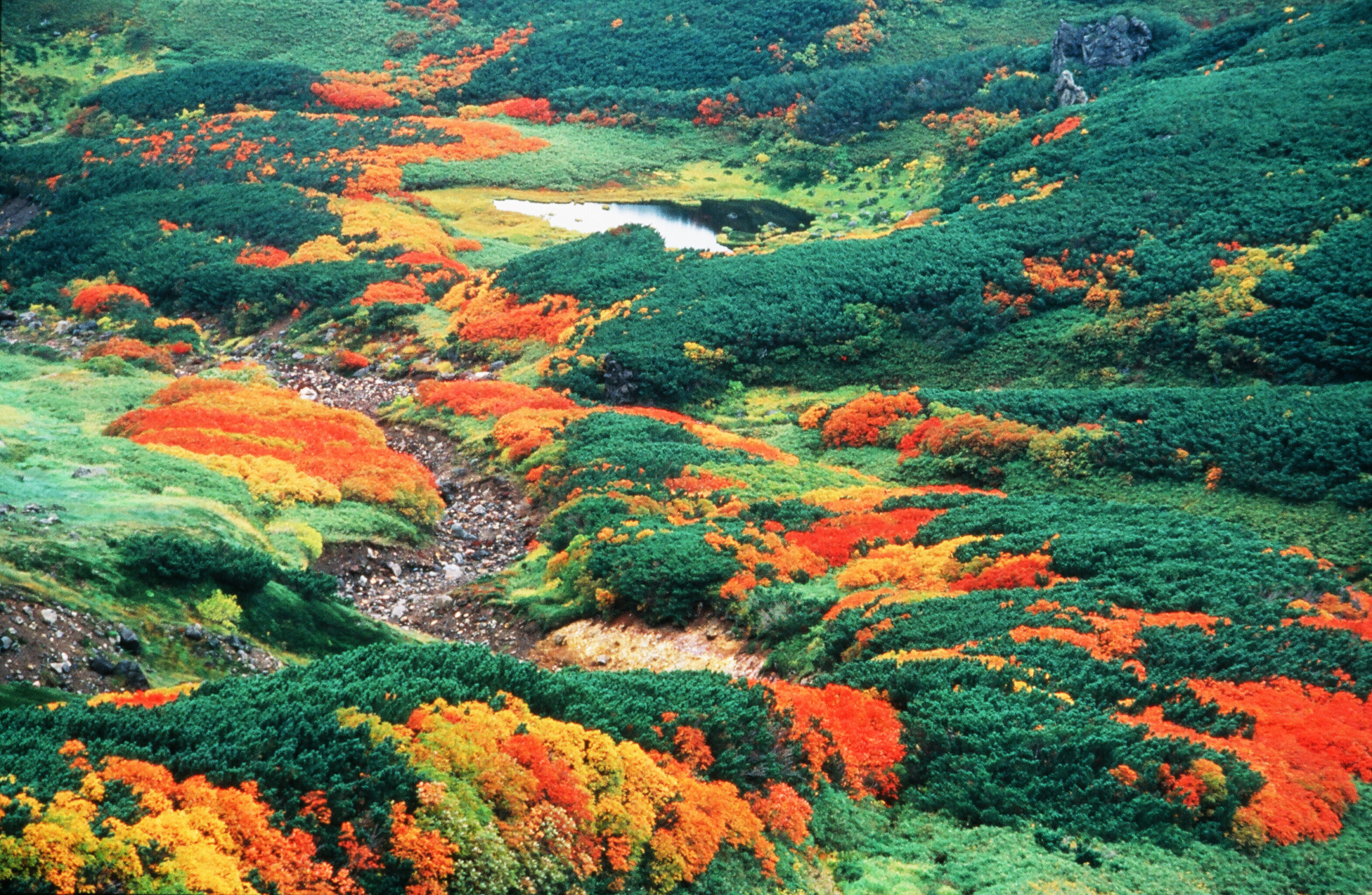 これは大雪山で撮った写真。一番紅葉が綺麗なときですね。赤、オレンジ、黄色、緑と、色鮮やかに山肌が染められ、息をのむほどの美しさです。