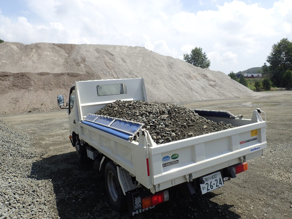 今日は防草シートの上に、砕石を乗せていきます。ウチのすぐ近くにある砂利組合に行って、ダンプに一杯ずつ、砕石を載せてもらいます。砂利を乗せる重機の大きいこと!たった1回で、ダンプの荷台に砕石が載せられます。何往復したんだろう、10回は行ったかな。
