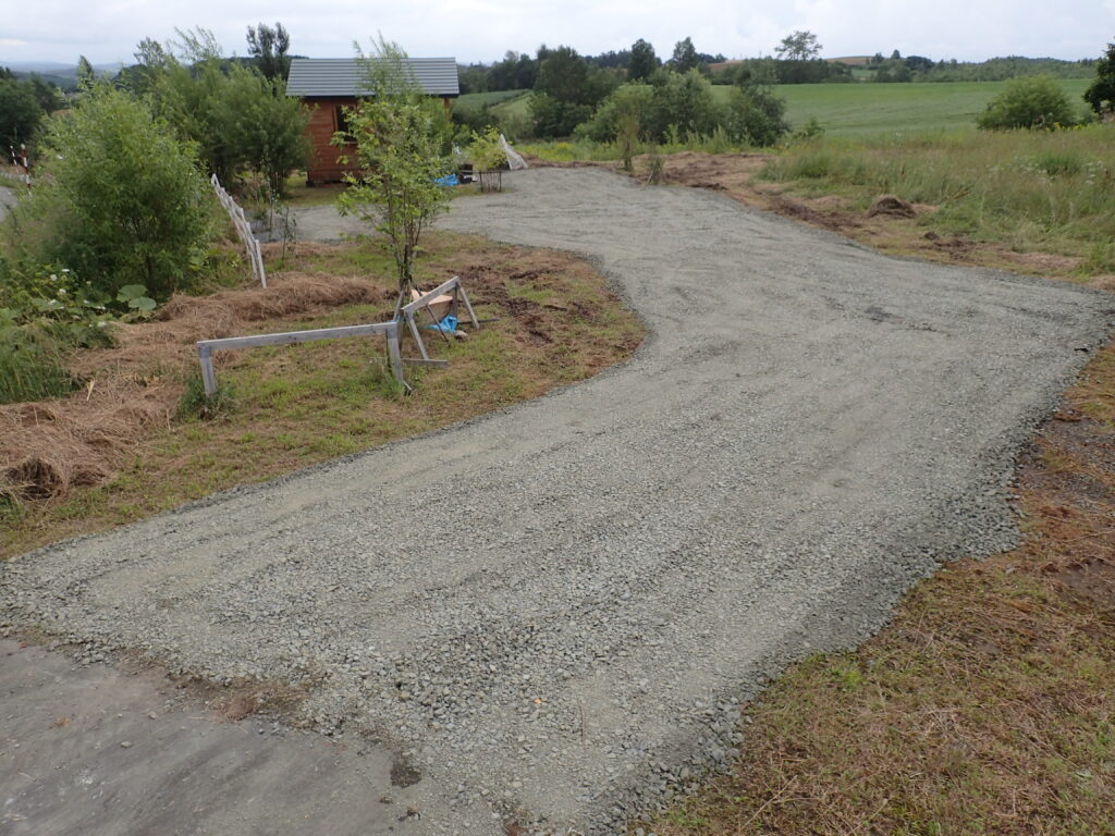 防草シートを敷いた場所に砕石を乗せていき、アプローチができました。これで毎回来るたびに草刈りをする手間も減るでしょう。我ながらよく頑張りました。