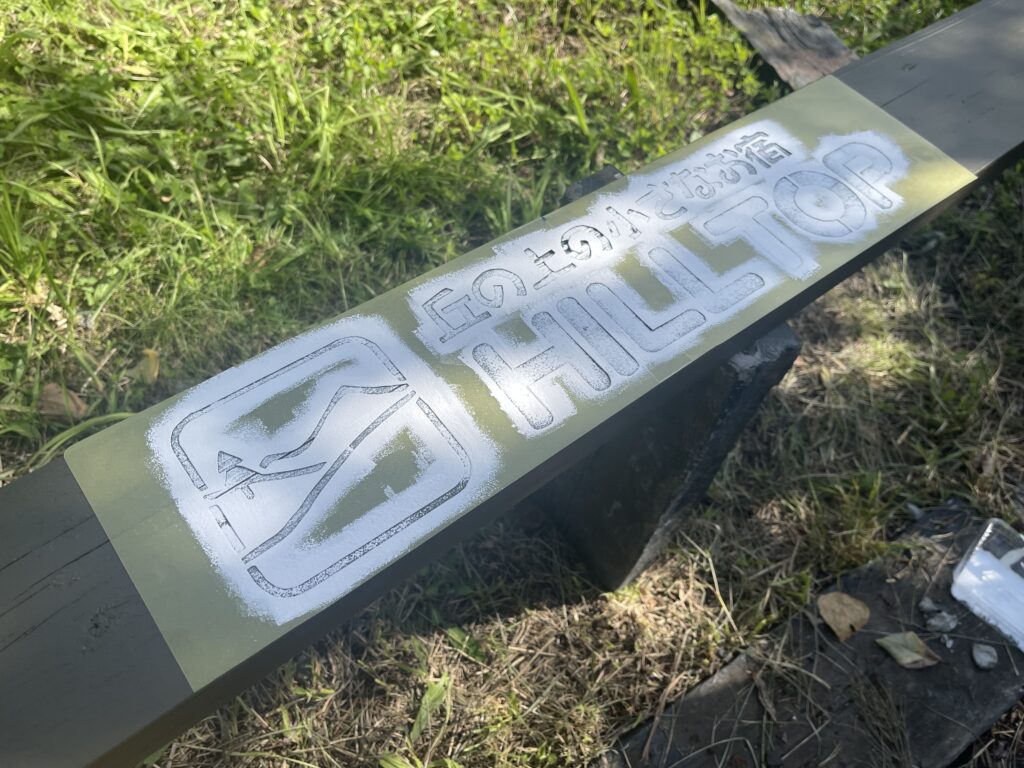 今まで入り口の所に置いてあったウマが、だいぶ色あせてきたので、ペンキを塗り直し、ついでに宿の名前をステンシルでつけてみました。切り抜いたクリアファイルを貼り付け、上からポンポンとスポンジにしませたペンキを優しく乗せていきます。スタンプの要領ですね。
