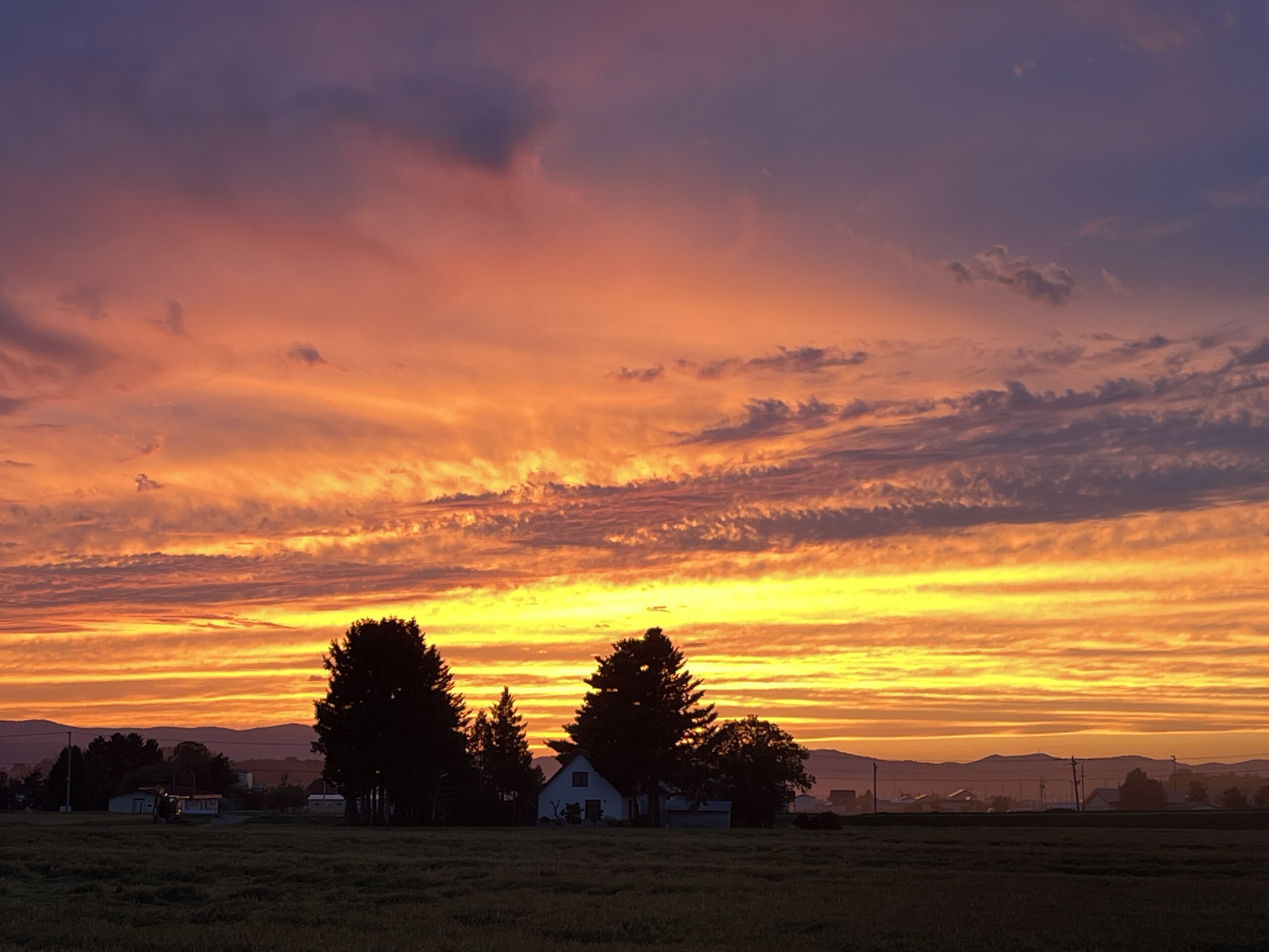 敷地の草刈りを終えて、隣町のお風呂へ行く途中、このように空が燃えました。絵になりますね。こんな空が出た次の日は、きっと晴れるでしょう。