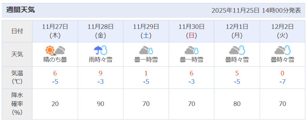 ですが、この先の週間予報を見ると、金曜日辺りから連日の雪マーク。2週間予報を見ても、ずーっと「曇り時々雪」です。12月に入ると最高気温が0℃以下になり、これで積雪すると溶けることはないでしょう。やっぱり根雪になるのは12月に入ってから、ということになりそうです。