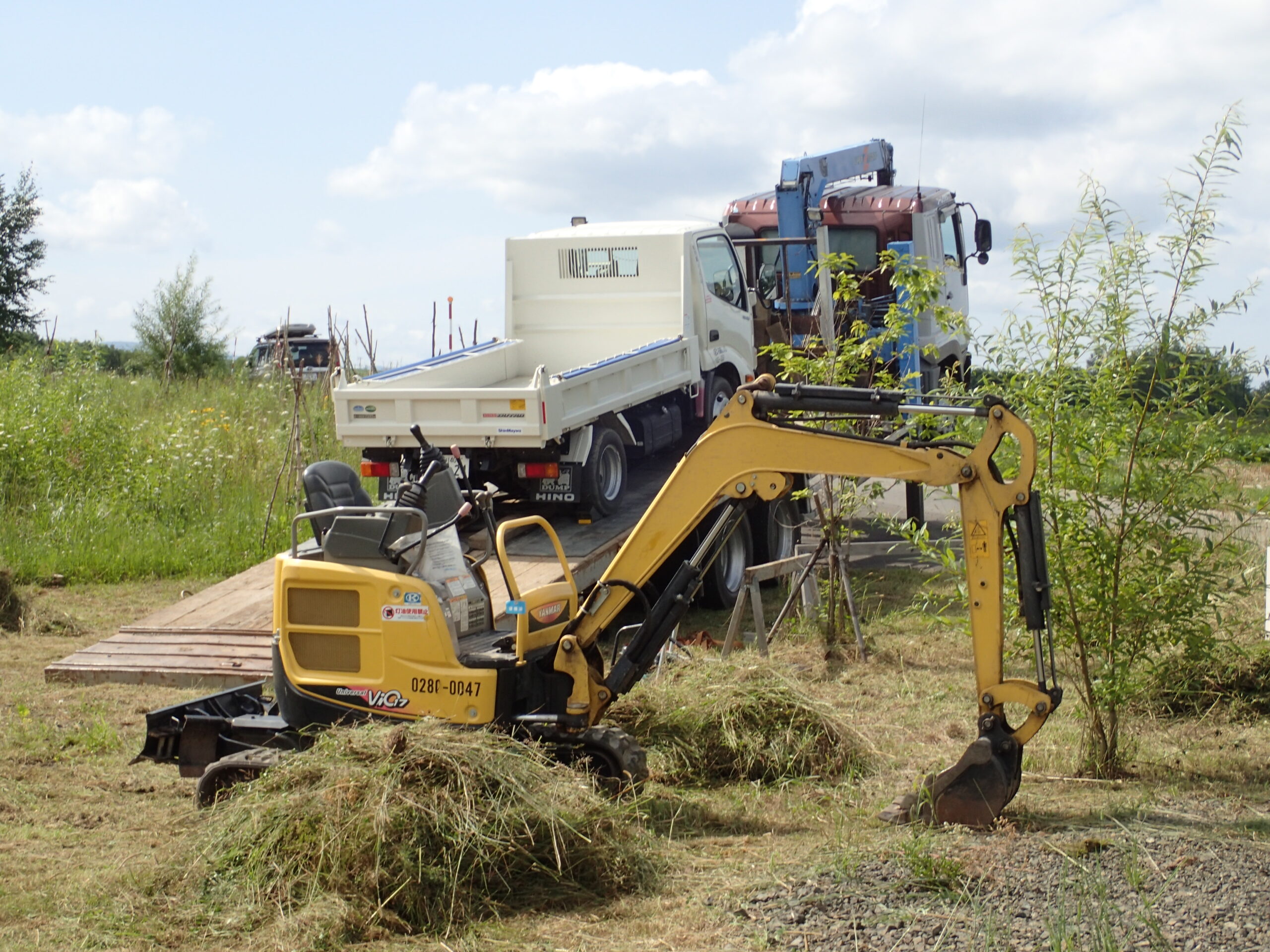 重機レンタル業者さんから、バックホー(いわゆるショベルカー)と、ダンプカー、プレート(転圧機)を借りました。これから土木工事の始まりです。