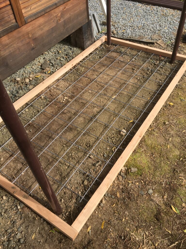 小屋の後ろ側に物置を設置しましたが、その場所に新たな農機具小屋を作ろうと思い、物置を小屋横に移動しようと思いました。そのために、物置を置く場所作りから始めます。