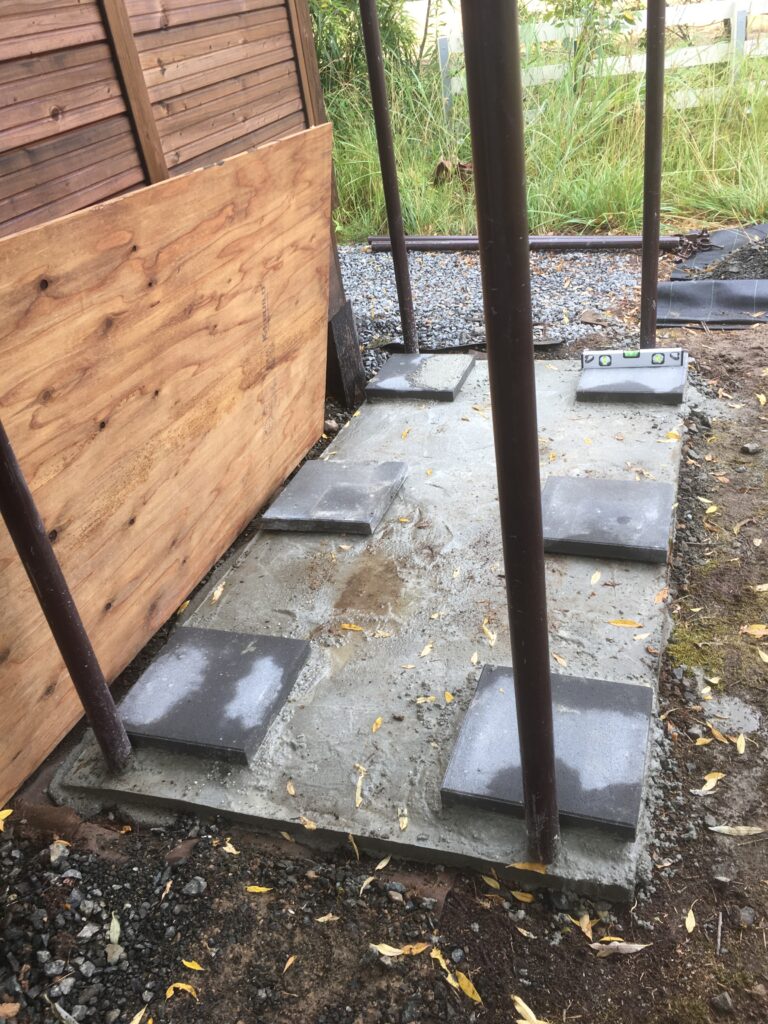 翌日、コンクリートが固まったのを確認して、上に一枚コンクリート板を乗せ、土台は完成です。この上に物置を設置していきます。