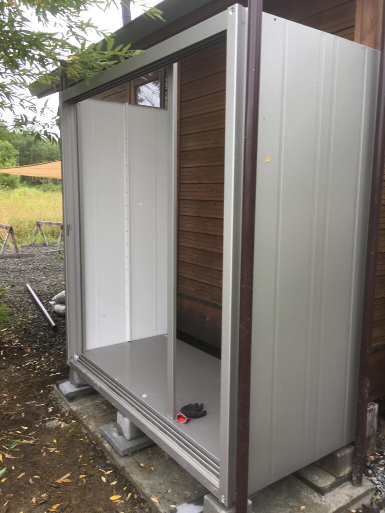基礎の上に物置を設置していきます。組み立て式なので作るのは簡単。