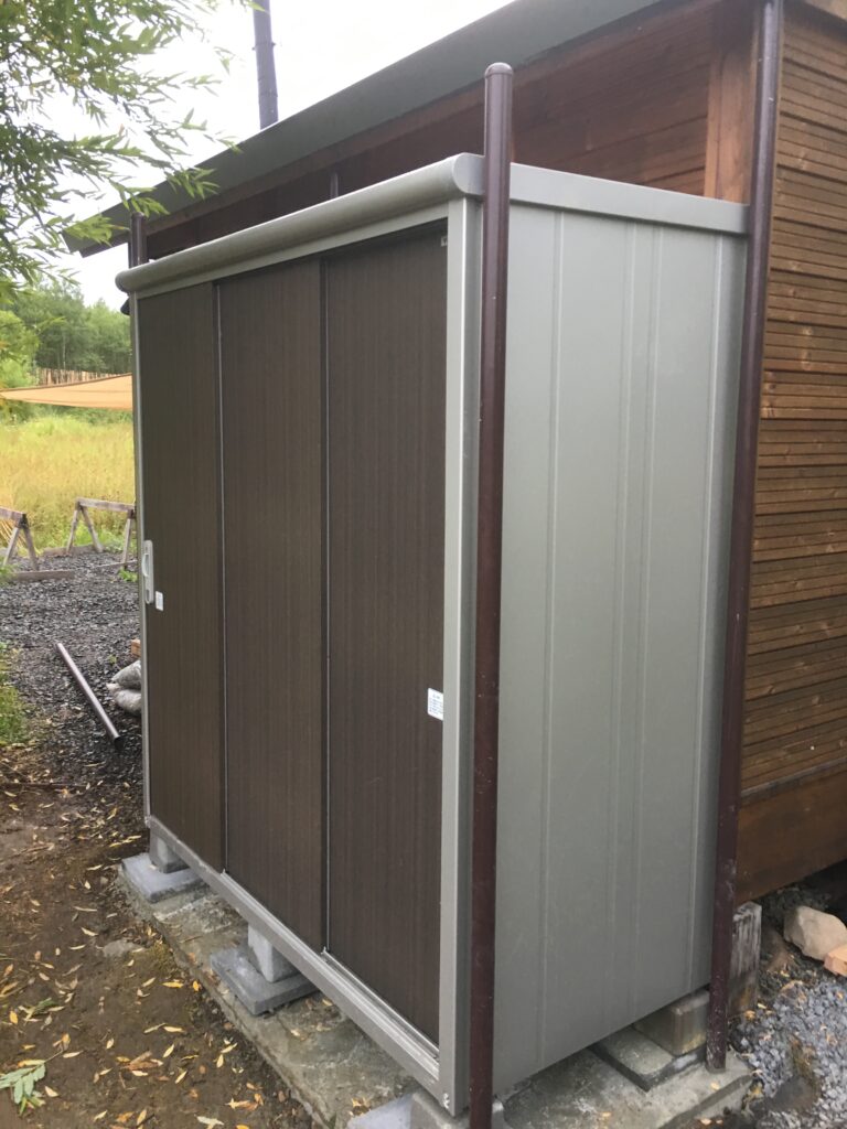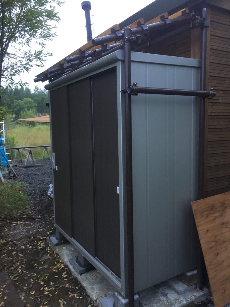 物置の外側角に茶色に着色した単管パイプが垂直に立っているのが分かりますか?このあと、まだやることがあるのです。