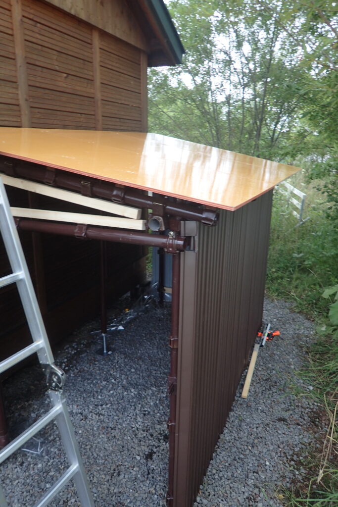 農機具小屋の壁ができたところで、次は屋根に取りかかります。屋根はまずコンパネ(片側に撥水加工がしてあるコンクリート打設用の物)を単管の上にビス留めします。この上に雪が積もるので、波板だけでは弱く、コンパネを貼ることで強度を出しました。