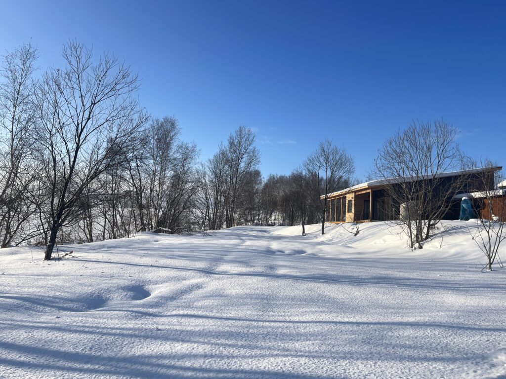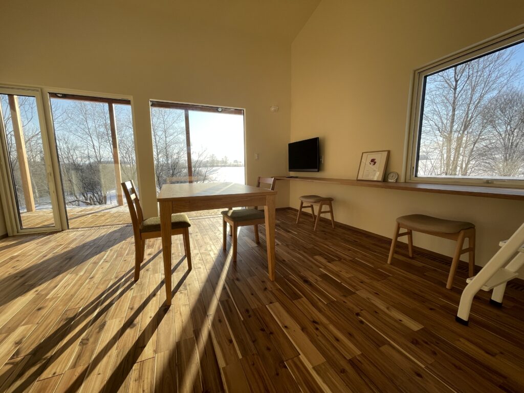 窓の外には広々とした畑の向こうに雄大な十勝岳がそびえていて、見あきることがありません。4.5m×4.5m(約12畳)の広さがあり、ソファベッド2台、壁際いっぱいのカウンターテーブル、テレビがあります。人数が多いときは、ソファベッドを展開して、ベッドにしてお休みいただけます。